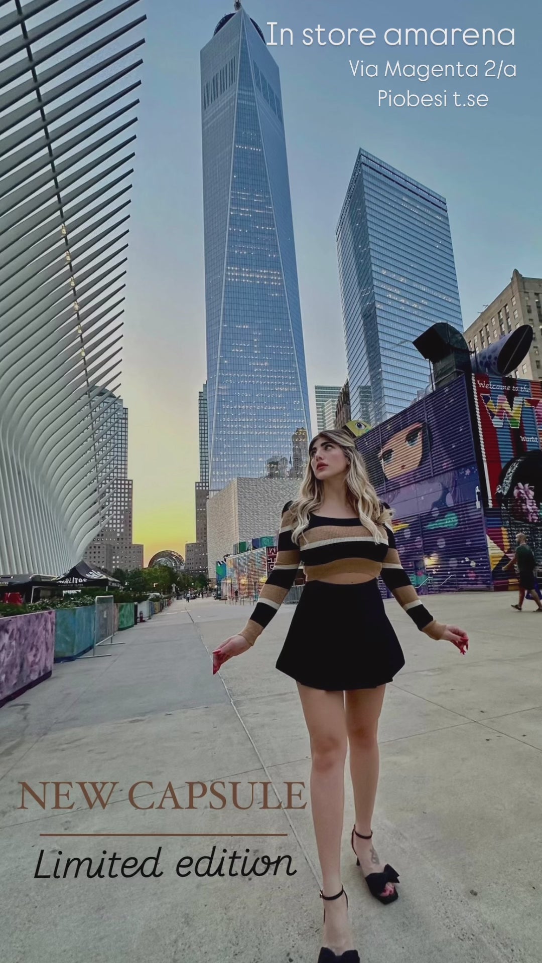 Il meraviglioso mini pull con scollo ampio e manica sbuffo, con i colori rigati del caramello e nero in versione lurex